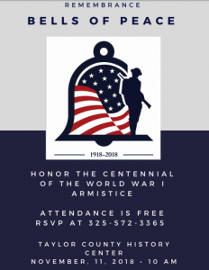 Remembrance on Veterans Day to honor the Centennial of the World War I Armistice with Bells of Peace at the Taylor County History Center Buffalo Gap, Texas (November 3, 2018) – The Taylor County History Center is pleased to announce its participation in Bells...